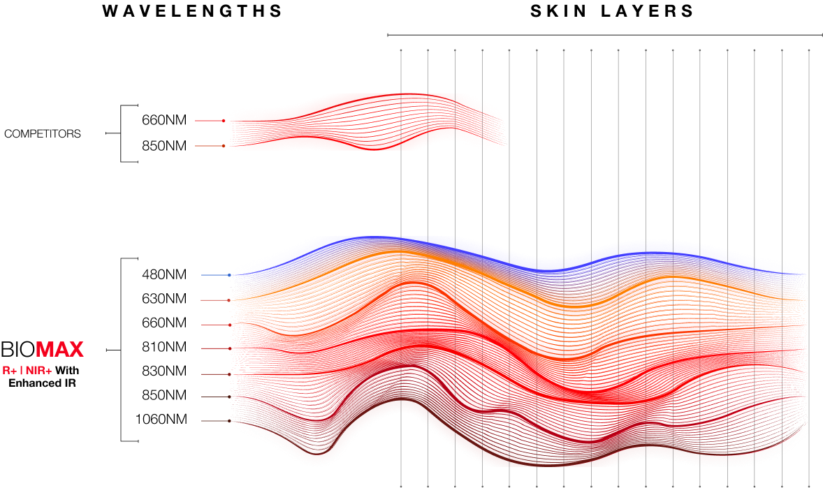Our exclusive patent-pending R+|NIR+ multi-wave spectral output delivers the most advanced red light therapy available: Harnessing seven different red and infrared wavelengths of light for truly next level therapy for all applications.