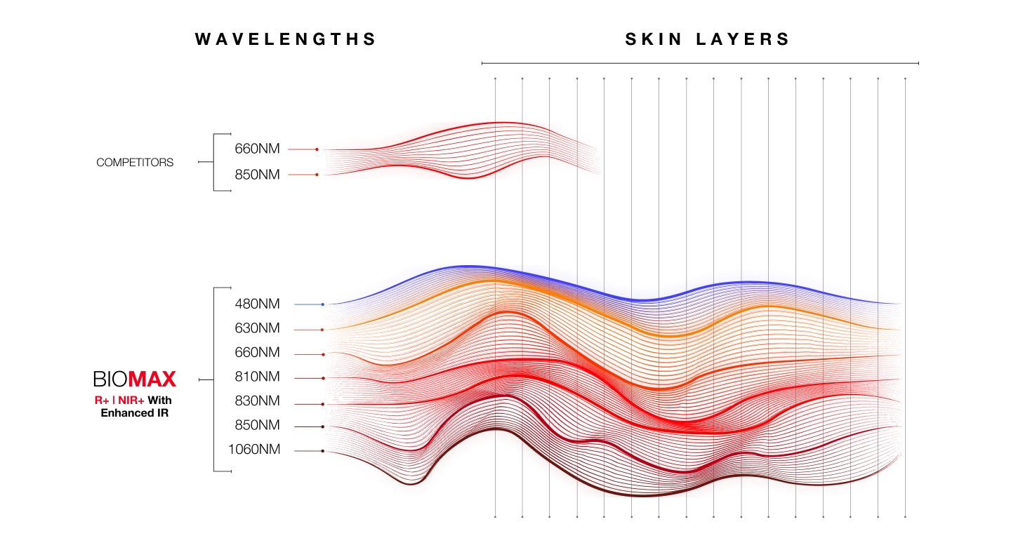 Our exclusive patent-pending R+|NIR+ multi-wave spectral output delivers the most advanced red light therapy available: Harnessing seven different red and infrared wavelengths of light for truly next level therapy for all applications.